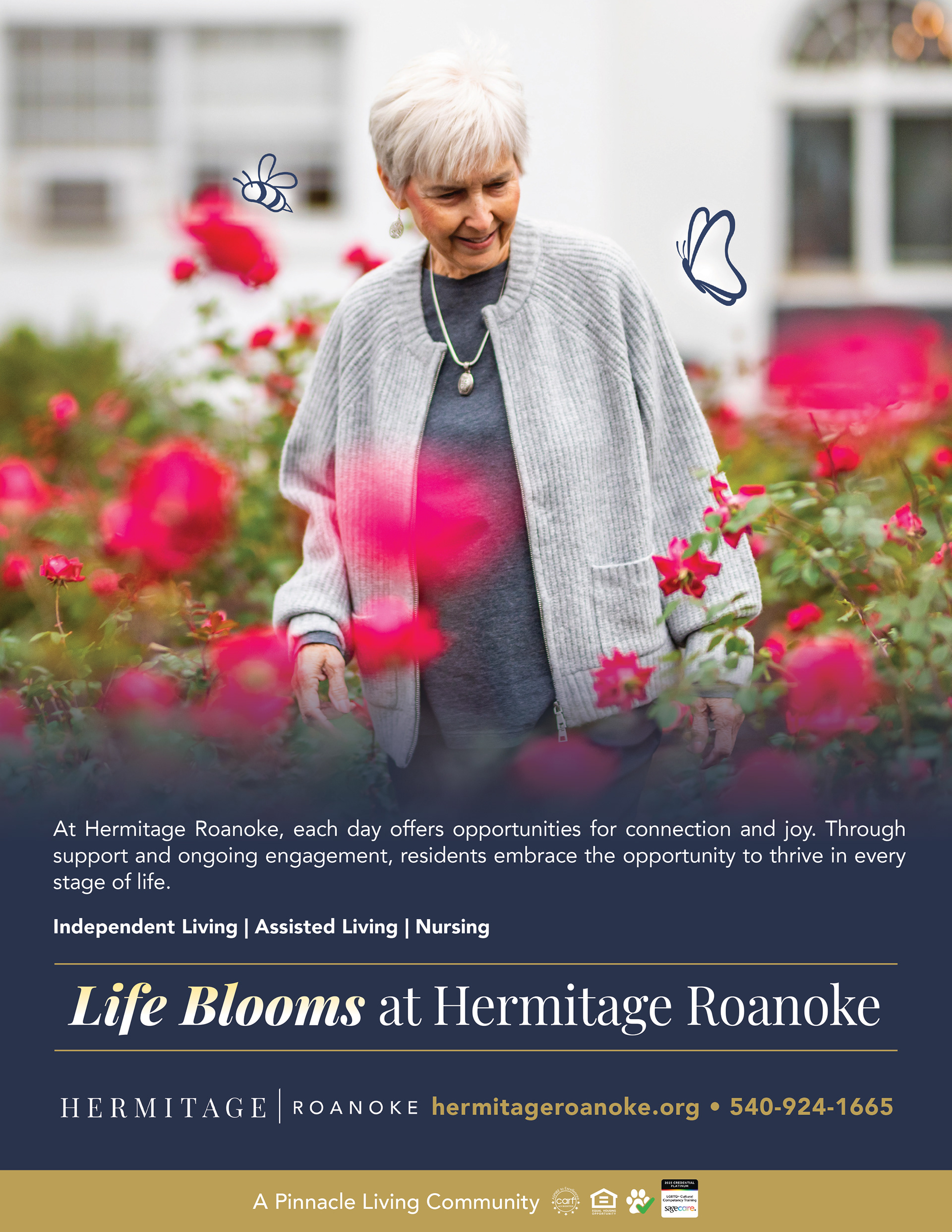 Pinnacle Living's rustic Roanoke community is celebrated for its beautiful grounds and Blue Ridge charm. The ad campaign focuses on residents relation to nature, and utilizes fun illustrations to drive home the tag of "Life Blooms."